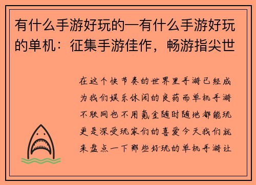在这个快节奏的世界里,手游已经成为我们娱乐休闲的良药。而单机手游,不联网也不用氪金,随时随地都能玩,更是深受玩家们的喜爱。今天,我们就来盘点一下那些好玩的单机手游,让你畅游指尖世界,享受游戏的乐趣。 1. Monument Valley 纪念碑谷 这是一款获奖无数的解谜游戏,其独特而精美的画面让人印象深刻。玩家需要帮助一个沉默的公主艾达通过一个个迷宫般的关卡,沿途欣赏令人惊叹的建筑和风景。 2. Alto's Odyssey 奥德赛 这是一款休闲的滑板游戏,玩家可以在白雪皑皑的山脉和风沙漫天的沙漠中自由驰骋。游戏的画面和音乐都非常出色,带给你身临其境的体验。 3. BADLAND 恶地 这是一款动作冒险游戏,玩家控制一群会飞的生物穿越一个个充满机关和陷阱的关卡。游戏画面黑暗而诡异,但玩法却非常有趣。 4. LIMBO 地狱边境 这是一款黑白风格的平台解谜游戏,玩家控制一个小男孩在阴暗的地狱中寻找失踪的妹妹。游戏的画面简单,但氛围却十分压抑和诡异。 5. INSIDE 潜行 这是一款和《地狱边境》同出自Playdead工作室的平台解谜游戏,玩家控制一个男孩在反乌托邦的世界中探险。游戏的画面和氛围都非常出色,带给玩家深入思考和令人难忘的体验。 6. Florence 弗洛伦斯 这是一款互动故事游戏,玩家体验一个年轻女孩弗洛伦斯的生活和爱情。游戏的画面和音乐都非常温馨细腻,带给你一段感人至深的旅程。 7. Kingdom Rush 边境保卫战 这是一款塔防游戏,玩家需要建造和升级塔楼来抵御敌人的入侵。游戏的画面和玩法都非常出色,带给你紧张刺激的战斗体验。 8. Stardew Valley 星露谷物语 这是一款像素风的模拟经营游戏,玩家继承了祖父的农场,在星露谷开始了新的生活。游戏玩法丰富,玩家可以种植农作物、饲养动物、结交朋友,打造一个属于自己的温馨家园。 9. Mini Metro 迷你地铁 这是一款益智游戏,玩家需要设计和规划地铁线路,以满足市民的出行需求。游戏的玩法简单,但却非常考验玩家的逻辑思维能力。 10. Death Road to Canada 死亡公路 这是一款末日求生游戏,玩家需要驾驶一辆汽车穿越被僵尸占领的美国,并寻找通往加拿大的避难所。游戏的画面和玩法都非常硬核,带给你一场刺激又残酷的生存冒险。 以上便是我们精选的单机手游佳作,希望你能从中找到自己喜欢的游戏,畅游指尖世界,享受游戏的快乐。